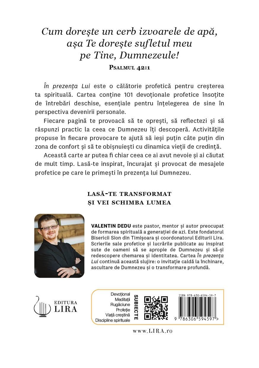 Valentin Dedu este pastor, mentor și autor preocupat de formarea spirituală a generației de azi. Este fondatorul Bisericii Sion din Timișoara și coordonatorul Editurii Lira. Scrierile sale profetice și lucrările publicate au inspirat sute de oameni să se apropie de Dumnezeu și să-și redescopere chemarea și identitatea. Cartea În prezența Lui continuă această slujire: o invitație caldă la închinare, ascultare de Dumnezeu și o transformare profundă.
